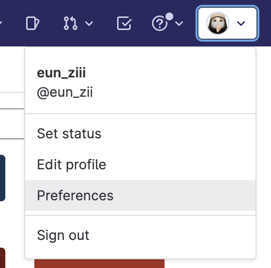 GitLab ์ค๋ฅธ์ชฝ ์๋จ ํ๋กํ ์ฌ์ง ํด๋ฆญ ํ, Preferences ๋ก ๋ค์ด๊ฐ๋ค.