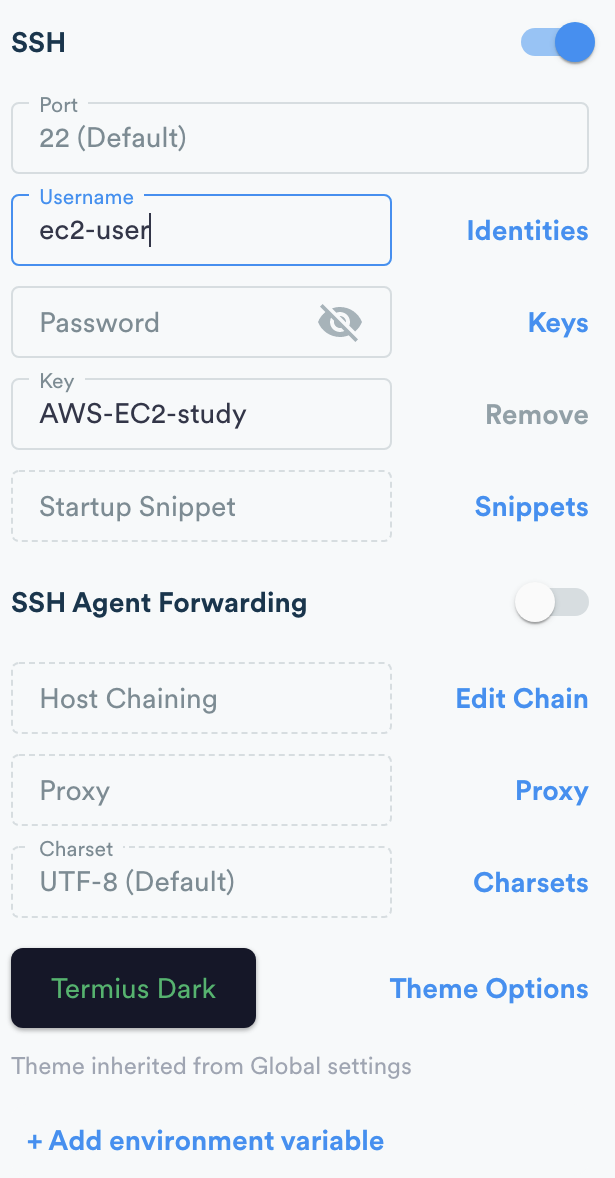 โก ์ด๋ฆ ๋ฑ๋กํ Drag & Drop ๋๋ import from keyfile ๋ก KEY-file(EC2 ํคํ์ดํ ๋ ๋ฐ์ .pemํ์ผ) ๊ฐ์ ธ์ค๊ธฐ