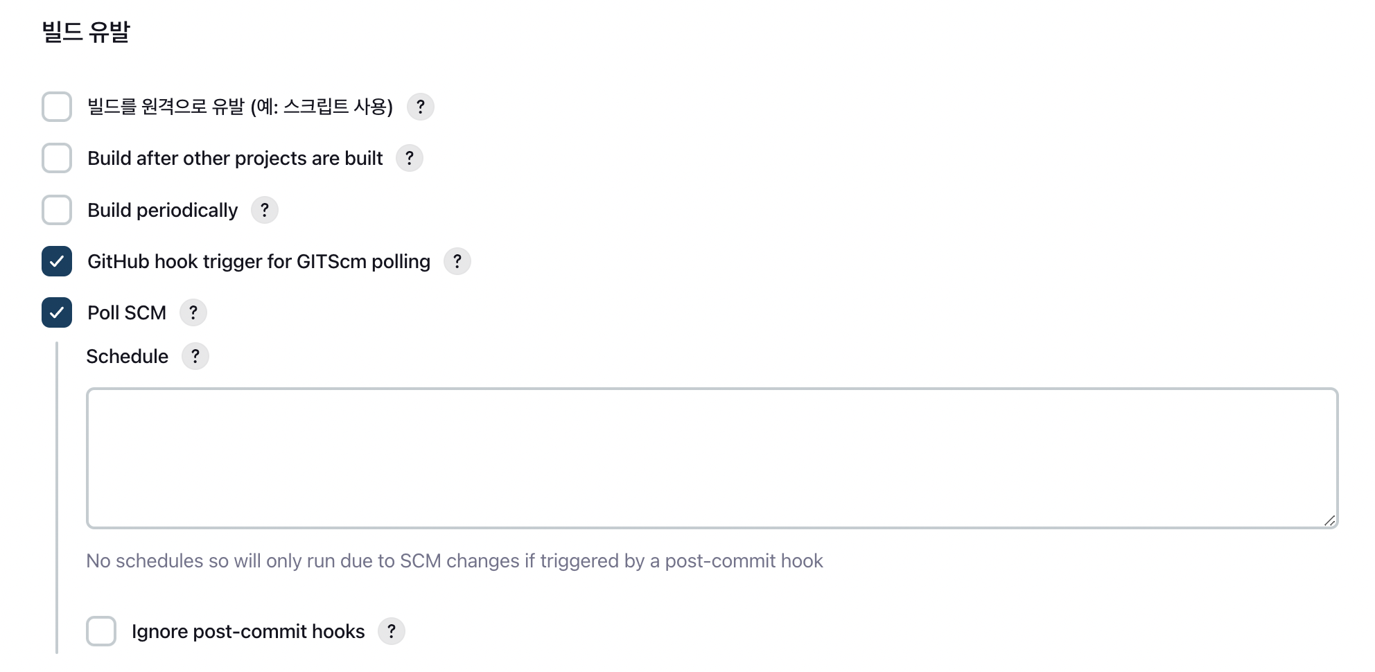 " GitHub hook.... " ๊ณผ " poll SCM " ์ฒดํฌ๋ฐ์ค ์ ํํ ์ ์ฅ