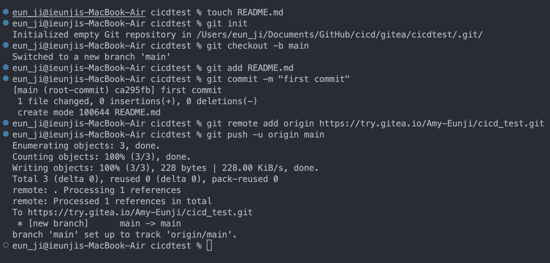 " git push -u origin main " ๊น์ง ๊ฐ๊ฐ ํ๋์ฉ