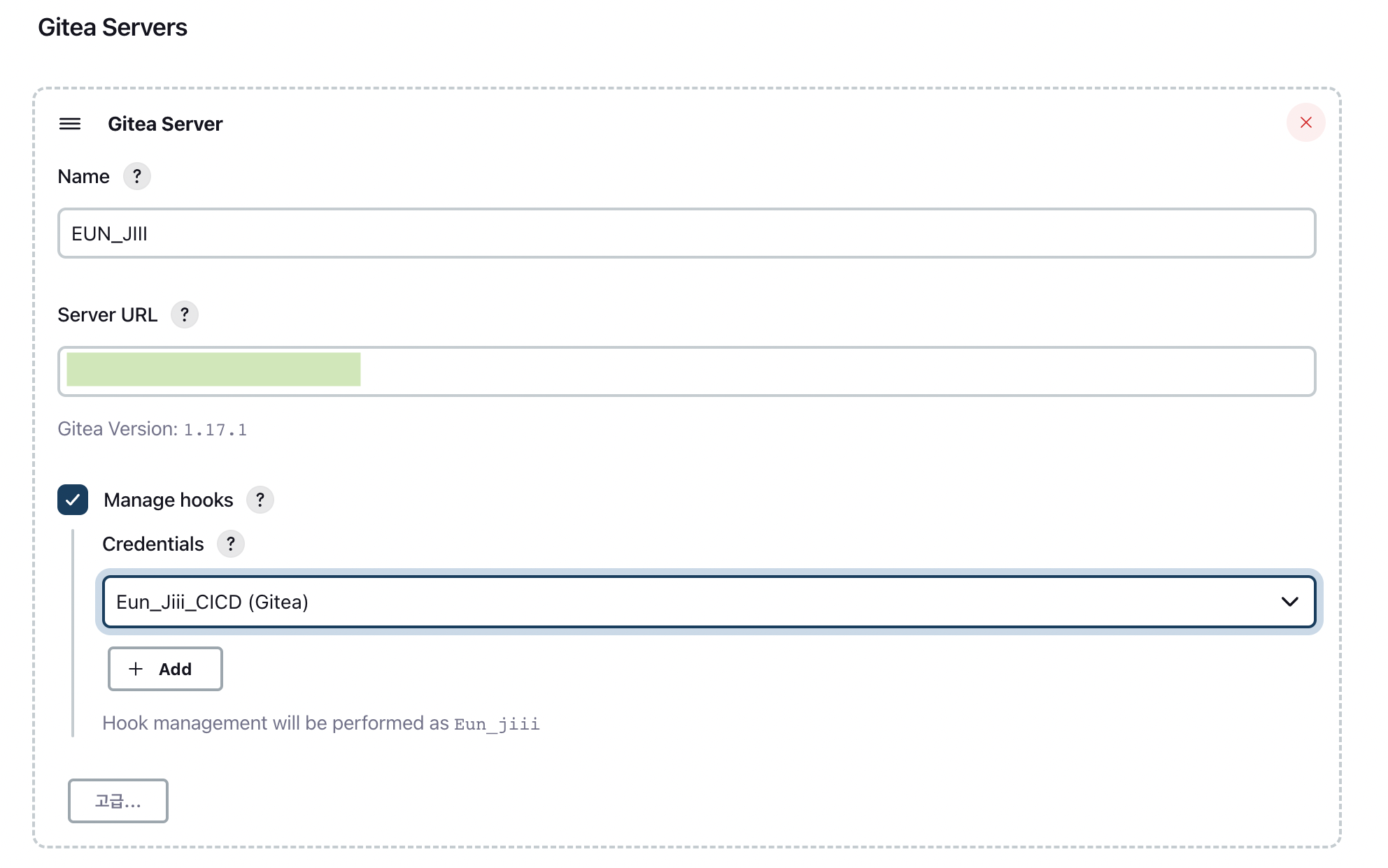 * Name, URL , Manage hooks ์ฒดํฌ ํ Credentials ์ ์ฉ (์์ผ๋ฉด + Add ํด๋ฆญ)