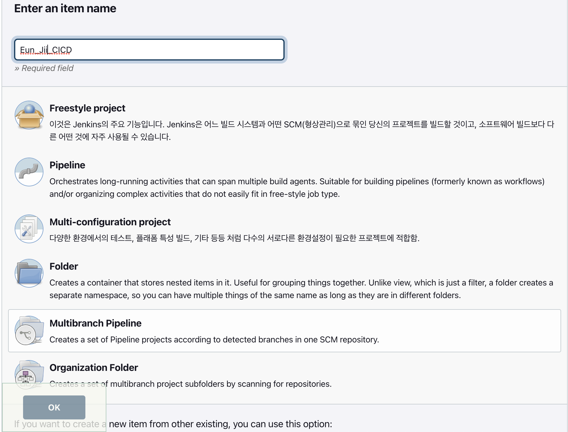 item name ์์ฑํ " Multibranch Pipeline " ์ ํํ OK