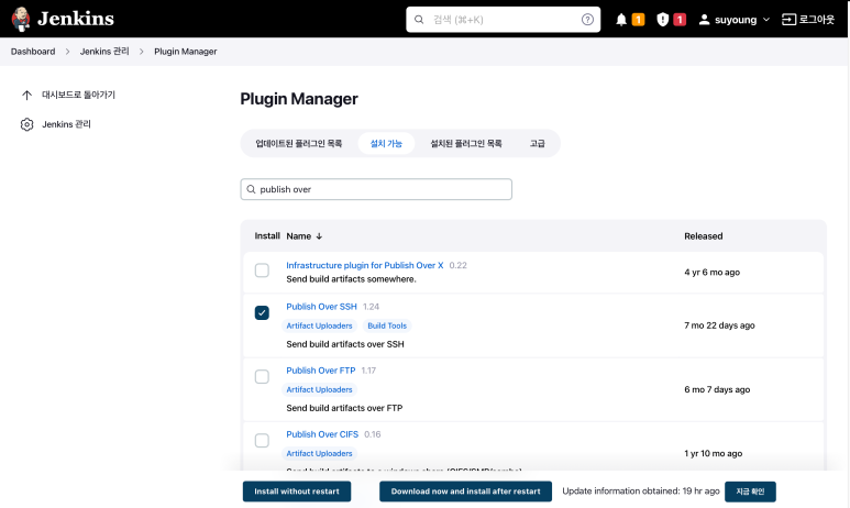 Jenkins Plugin ๊ด๋ฆฌ์์ Publish over SSH ํ๋ฌ๊ทธ์ธ์ ์ค์น ํด์ค๋๋ค.