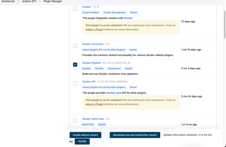 Jenkins ์์ ๋์ปค ๋ช ๋ น์ด๋ฅผ ์ฌ์ฉํ๊ธฐ ์ํด์๋ ๋์ปค์ ๋์ปค ํ์ดํ๋ผ์ธ ํ๋ฌ๊ทธ์ธ์ ์ค์น ํด์ฃผ์ ์ผ ํฉ๋๋ค.