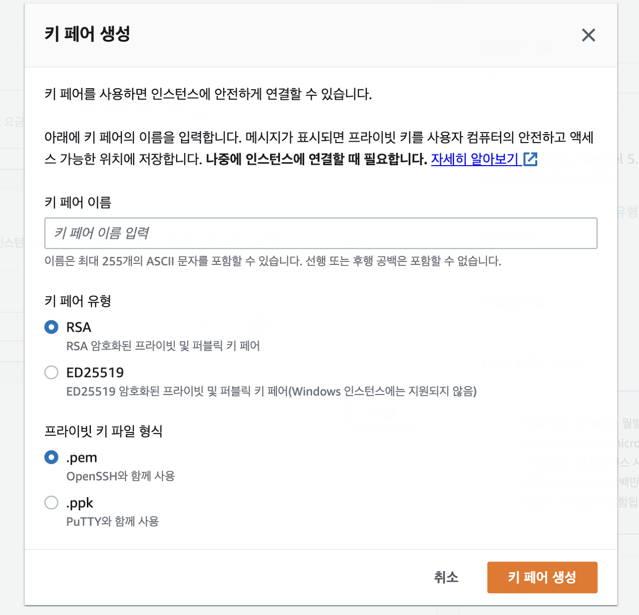 ์ด๋ฆ ๋ฑ๋กํ Drag & Drop ๋๋ import from keyfile ๋ก KEY-file (EC2 ํคํ์ดํ ๋ ๋ฐ์ .pemํ์ผ) ๊ฐ์ ธ์ค๊ธฐ